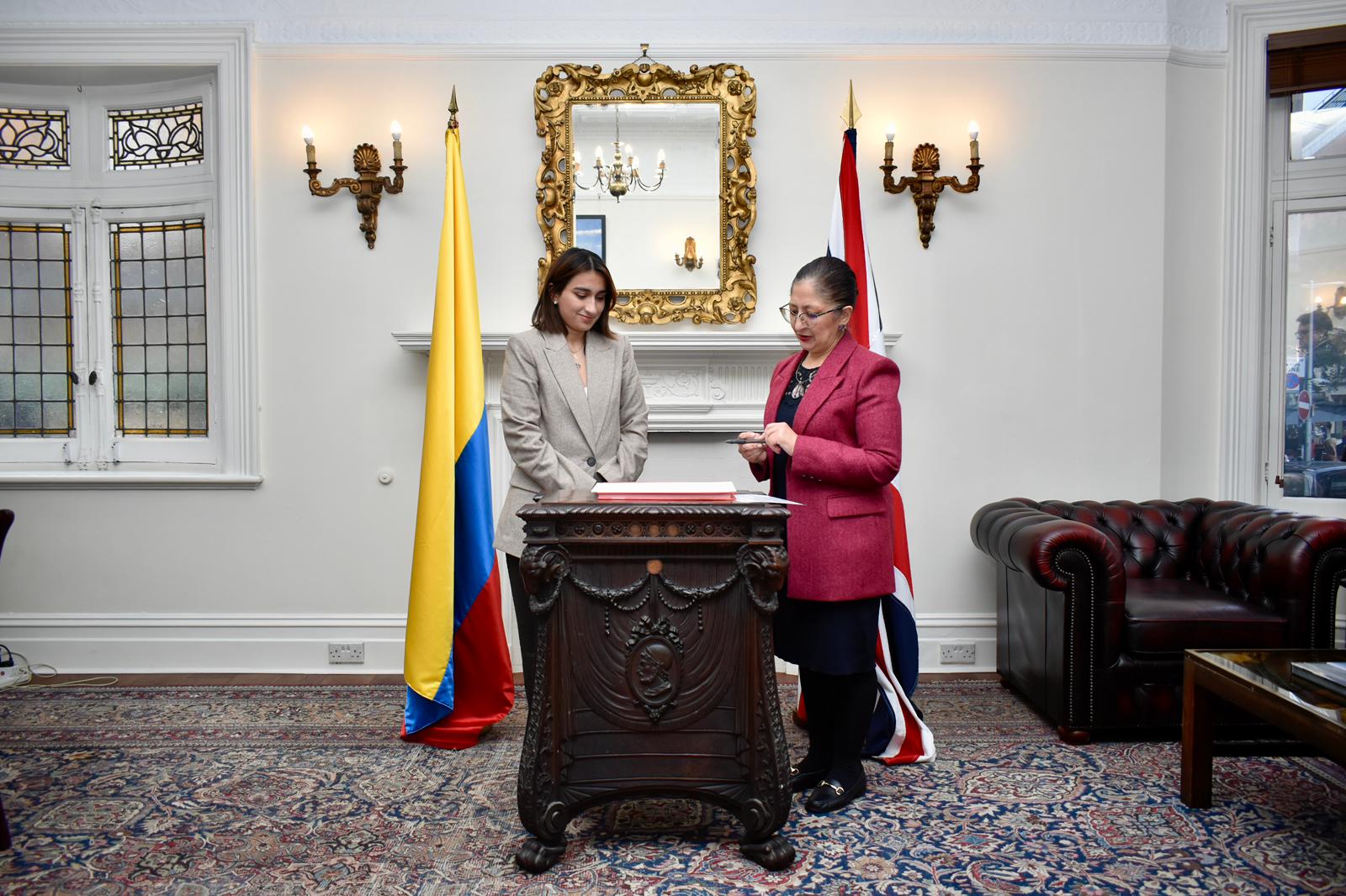 La embajadora de Colombia ante el Reino Unido, Laura Sarabia, tomó hoy posesión oficial de su cargo en la sede de la Embajada de Colombia en Londres.